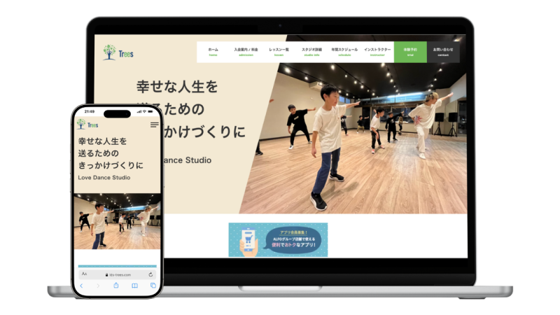 埼玉県のダンススクール「Love Dance Studio Trees」の会員管理・レッスン予約プラットフォーム。40以上のレッスン管理、クーポン検証システム、Kintone・Google Sheets連携による業務自動化を実装。