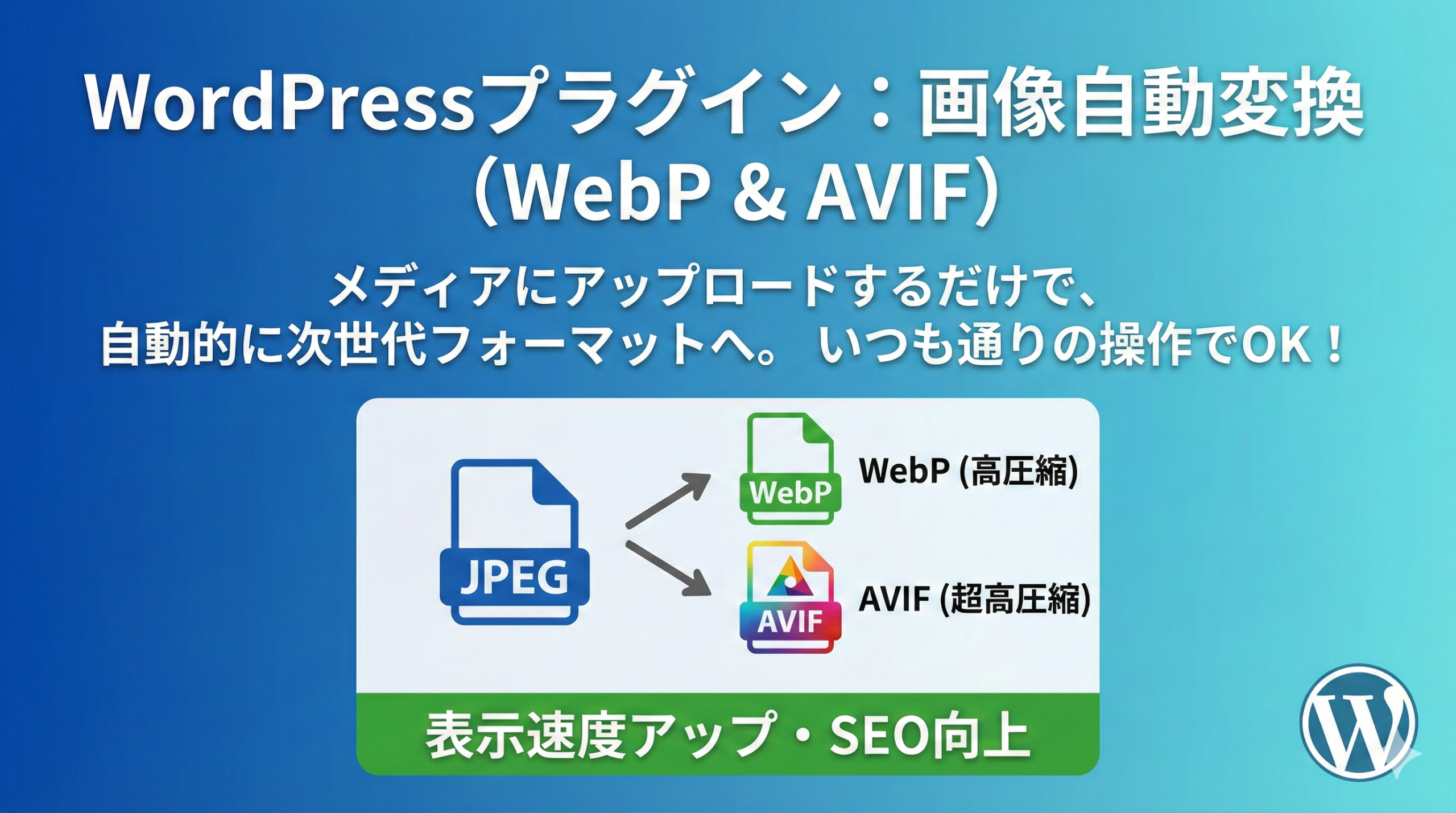 WordPressにアップロードした画像を、次世代フォーマット(WebP・AVIF)に自動で変換するプラグインです。面倒な設定や手動変換は不要。いつも通り画像をアップロードするだけで、サイトの表示速度を改善できます。